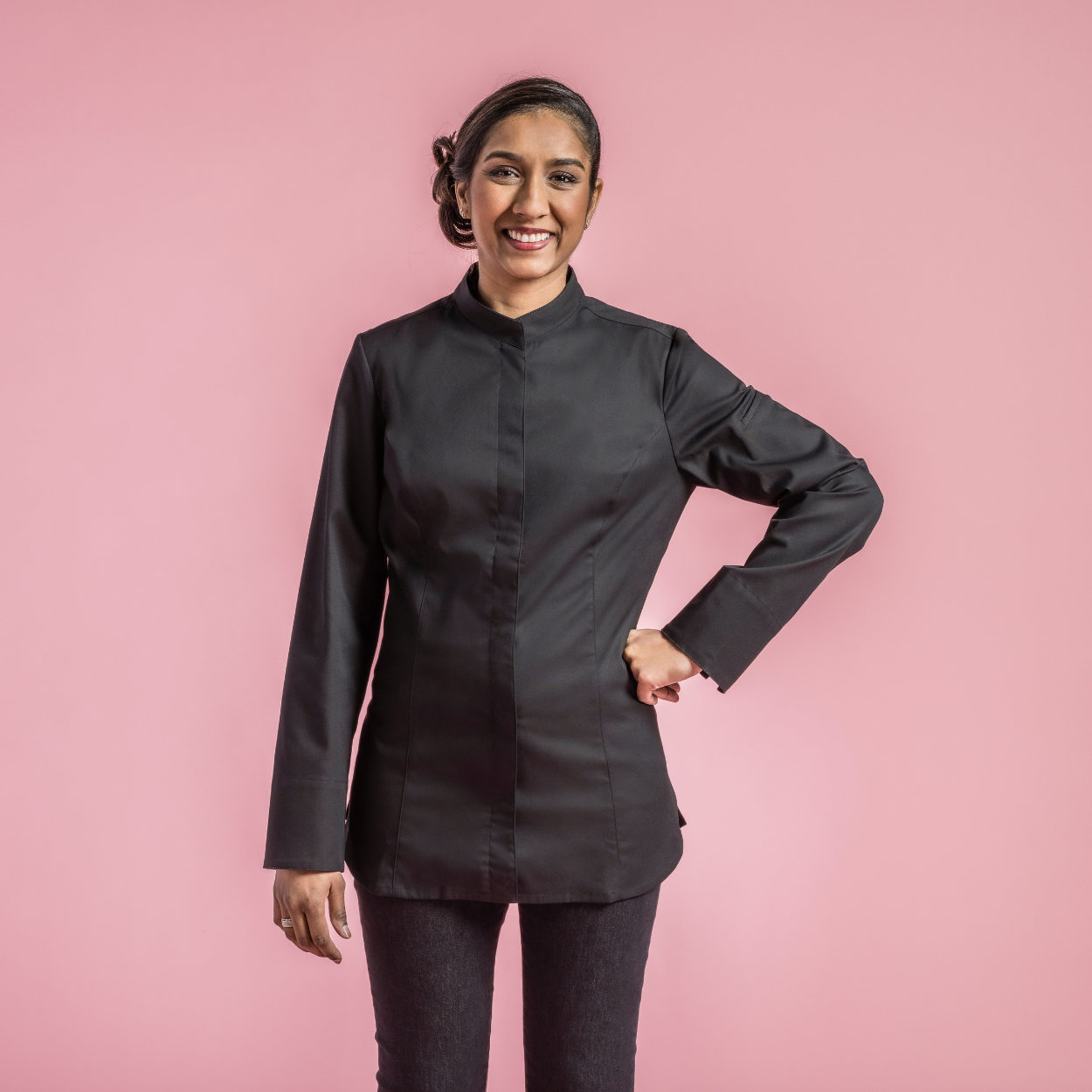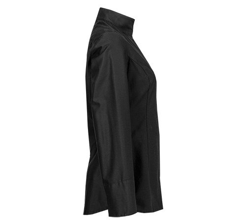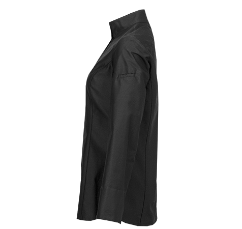 Women’s Chef Jacket with an edge-to-edge front collar band. Hidden snap buttons. Pen pocket on the left sleeve. Side slits.