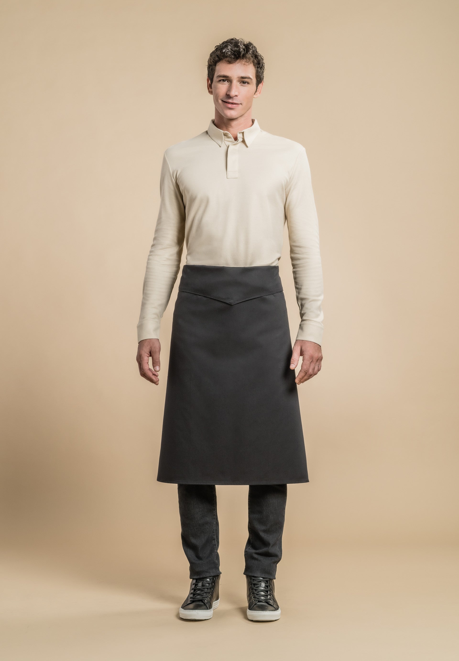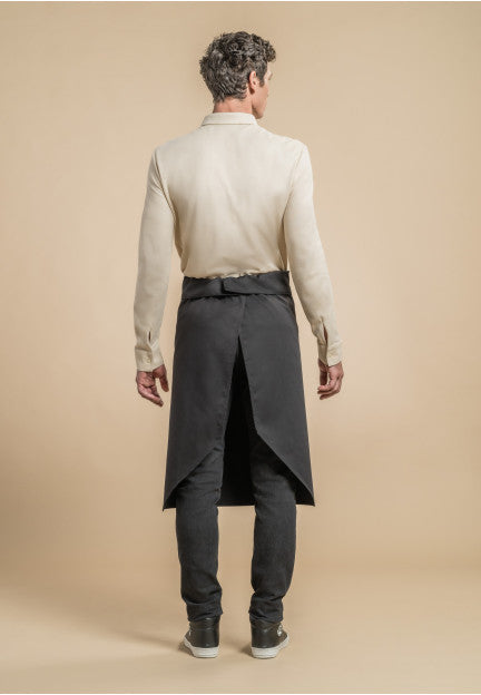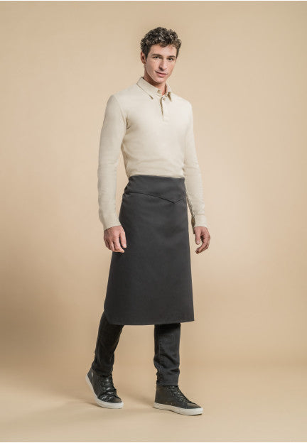 Waist apron with a top flap and ties.