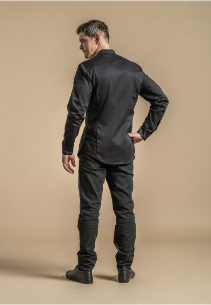 - Design: Chef shirt jacket with rounded mandarin collar and fitted cut.