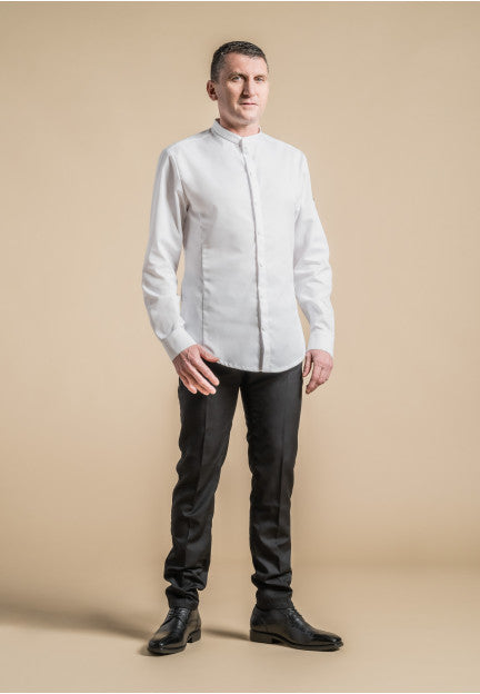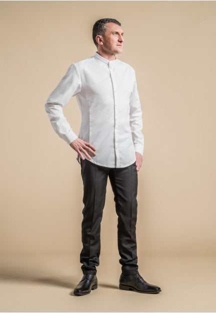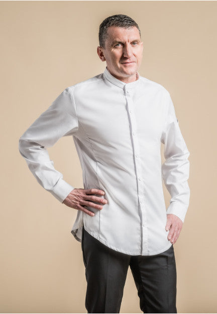 - Design: Chef shirt jacket with rounded mandarin collar and fitted cut.